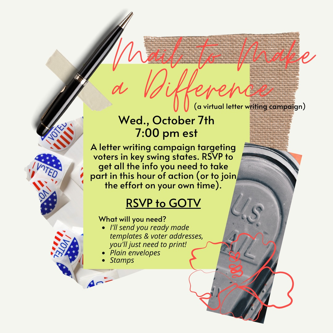 You still have plenty of time to sign up for Mail to Make a Difference! On October 7th we will be gathering for an hour of action, coming together to write letters to voters in key swing states. A handwritten touch to get them a final boost to show up to the polls. RSVP today to take part.